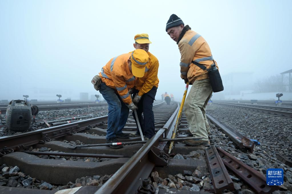 1月13日,中國鐵路上海局集團有限公司合肥工務(wù)段工作人員在合肥東站進(jìn)行鋼軌更換作業(yè)。