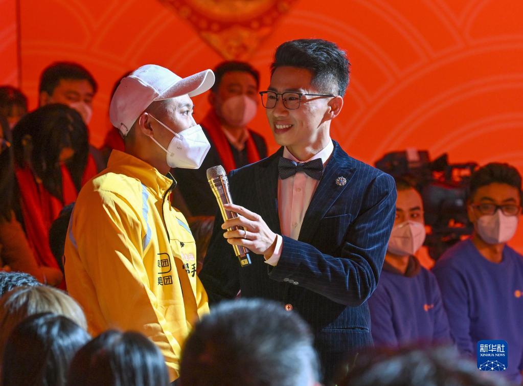 1月13日,見(jiàn)義勇為“00后”美團外賣(mài)騎手羅蟲(chóng)董(左)受邀在新春聯(lián)誼會(huì )現場(chǎng)為觀(guān)眾送上祝福。