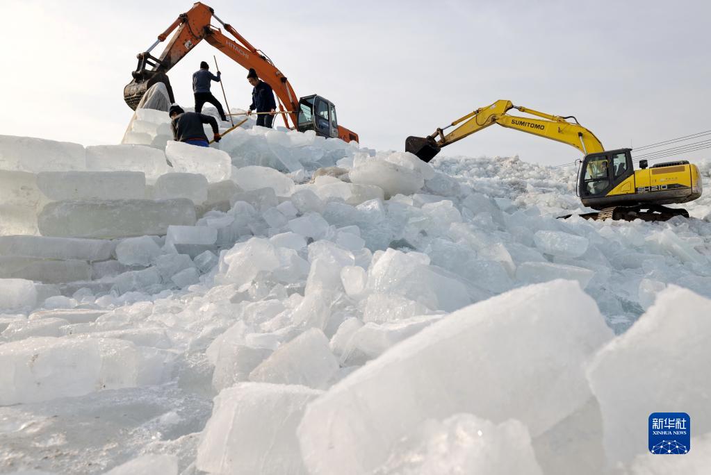 1月14日,河北省唐山市豐南區黑沿子鎮的農民在整理碼放采集的冰塊。