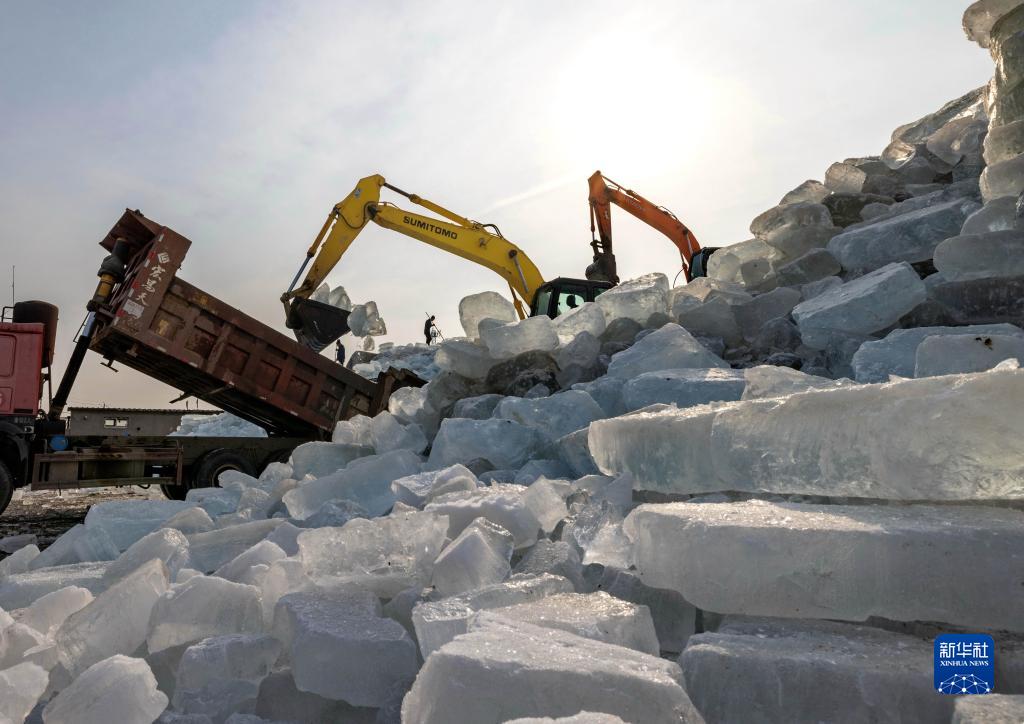 1月14日,河北省唐山市豐南區黑沿子鎮的農民在整理碼放采集的冰塊。