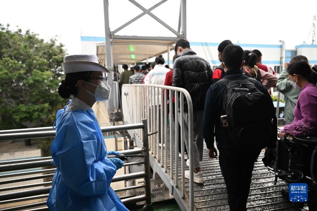 肖遙(左)在旅客登上棧橋離船時(shí)值守(1月8日攝)。