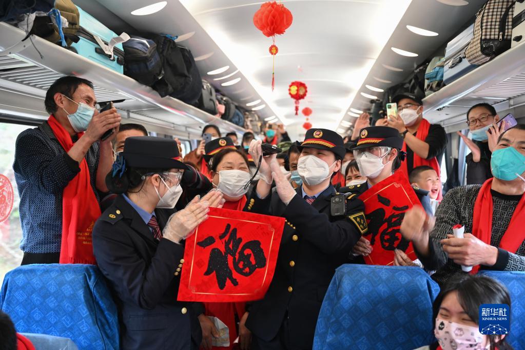 1月13日,K1268次列車(chē)的乘客和乘務(wù)員在車(chē)廂里唱歌。