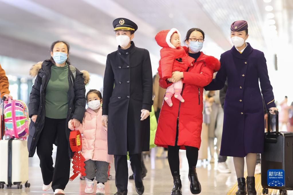 1月14日,毛靜(左三)和毛雯(右一)幫扶重點(diǎn)旅客上車(chē)。