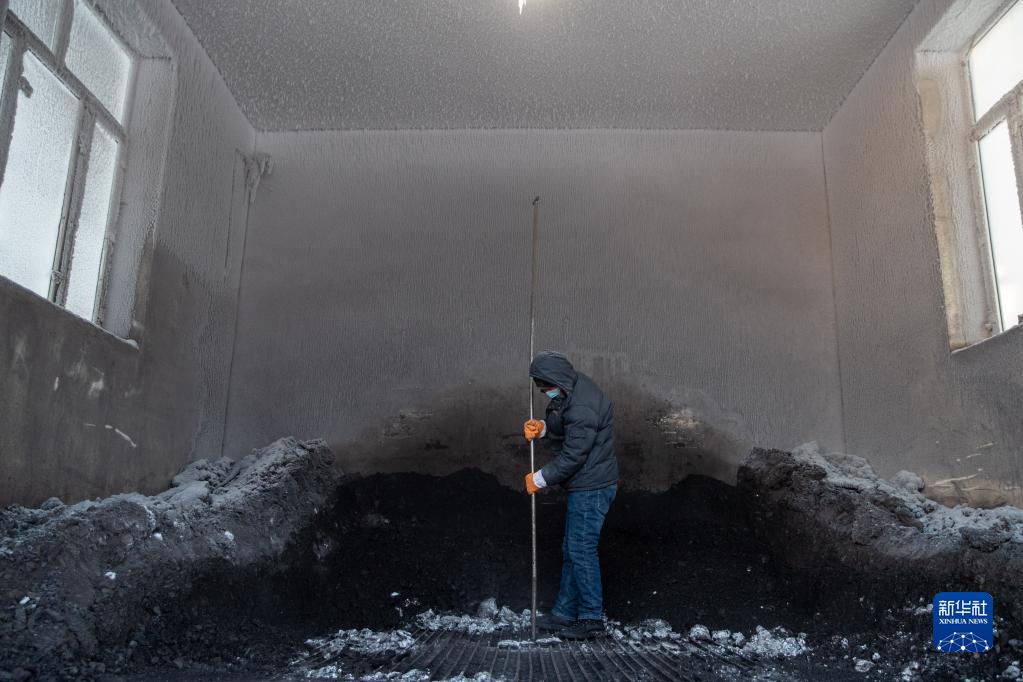 1月13日,工作人員在漠河華美供熱有限公司內進(jìn)行上煤作業(yè)。
