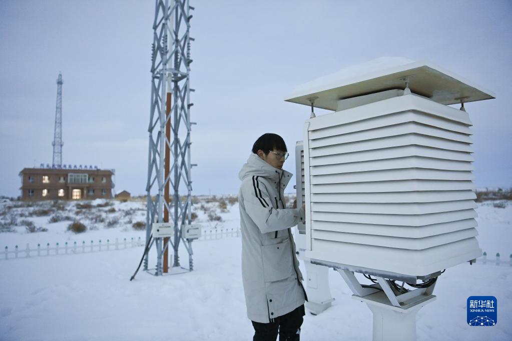 1月8日,阿克達拉國家大氣本底站觀(guān)測員謝翔在巡視地面觀(guān)測場(chǎng)儀器設備,清潔儀器和百葉箱。