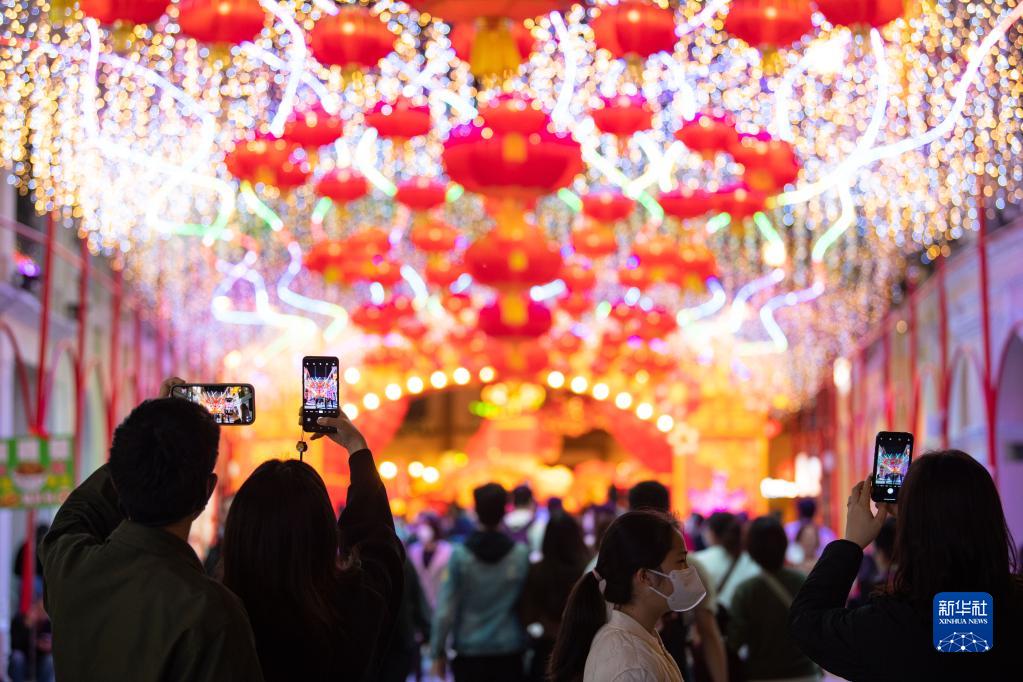 1月14日,市民在澳門(mén)議事亭前地觀(guān)賞春節燈飾。