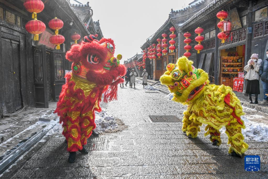 1月14日,民間藝人在山西平遙古城內表演舞獅。