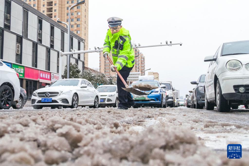1月14日,交警在山西省運城市中心城區清理冰雪。