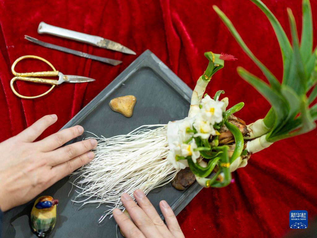 多年來(lái),福建漳州花農探索出種球閹割、三年復種的水仙種植技術(shù),收獲鱗莖碩大、花苞較多的花球。一顆飽滿(mǎn)的水仙花球要通過(guò)雕刻師開(kāi)蓋、疏隙、削葉等雕刻步驟初步成形,經(jīng)過(guò)一個(gè)月左右的養護,再加以創(chuàng )意雕琢,塑造出各式各樣的水仙花雕藝盆景,為新春佳節增添一抹詩(shī)情畫(huà)意。新華社發(fā)(張旭 攝)