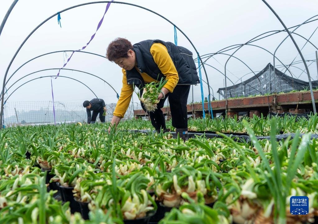 1月13日,在福建省漳州高新區九湖鎮田中央村,花農挑選養護好的水仙準備打包。