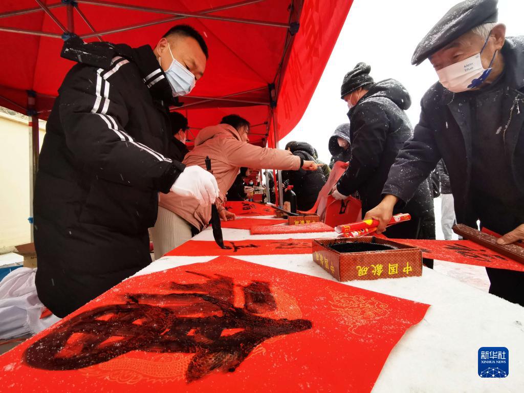 1月14日,在山東省濱州市濱城區北鎮大集,書(shū)法愛(ài)好者在“黃河大集”春節季活動(dòng)中為人們書(shū)寫(xiě)春聯(lián)。