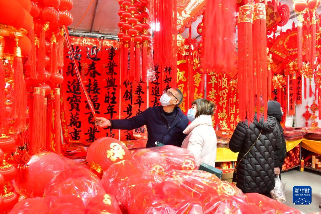 1月15日,在浙江省建德市更樓街道一家年貨集市上,人們選購春節飾品。