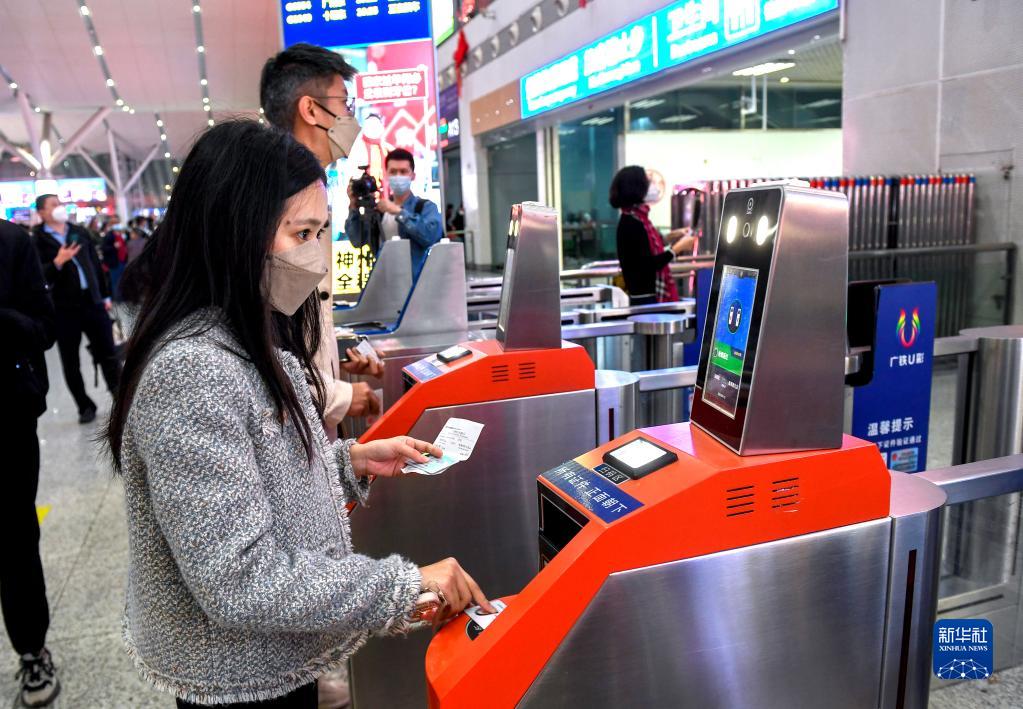 1月15日,在深圳北站,搭乘恢復通車(chē)后內地駛往香港首趟列車(chē)G5607次的乘客通過(guò)閘機進(jìn)站。