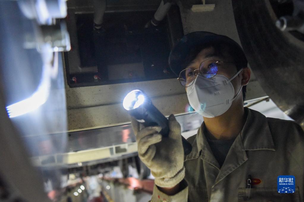 1月14日晚,在烏魯木齊車(chē)輛段動(dòng)車(chē)組運用所,機械師在檢查動(dòng)車(chē)組制動(dòng)盤(pán)。