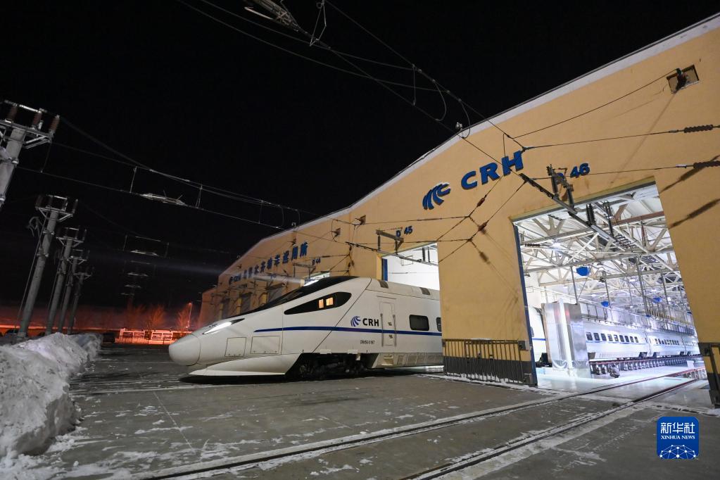 1月14日晚,完成檢修的動(dòng)車(chē)組駛出烏魯木齊車(chē)輛段動(dòng)車(chē)組運用所檢修庫。