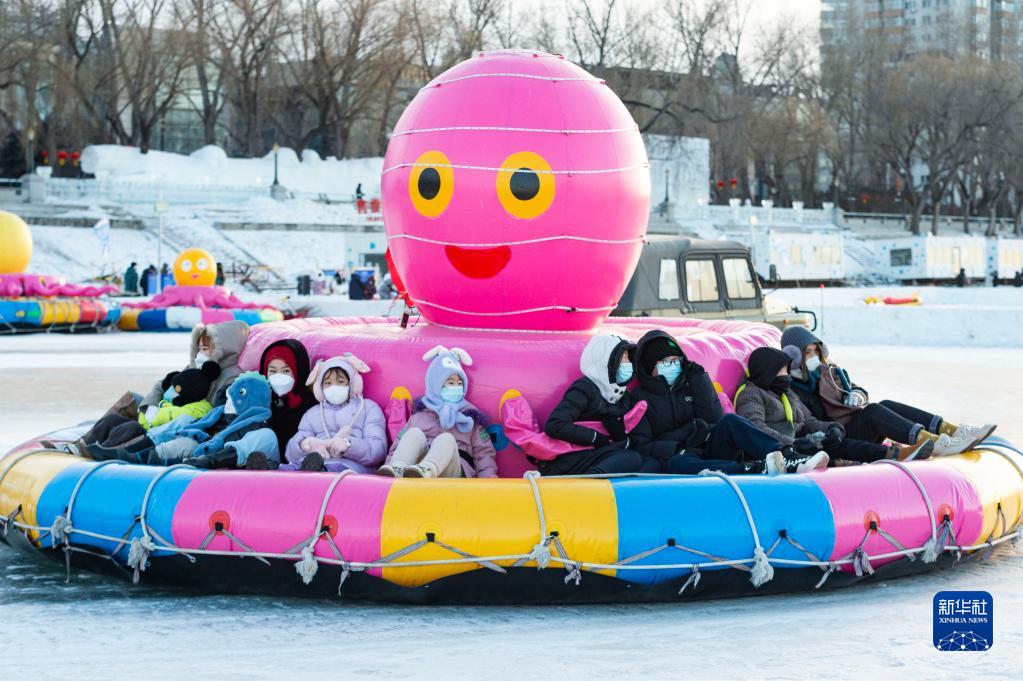 1月14日,游客在哈爾濱松花江冰雪嘉年華園區內體驗冰雪娛樂(lè )項目。