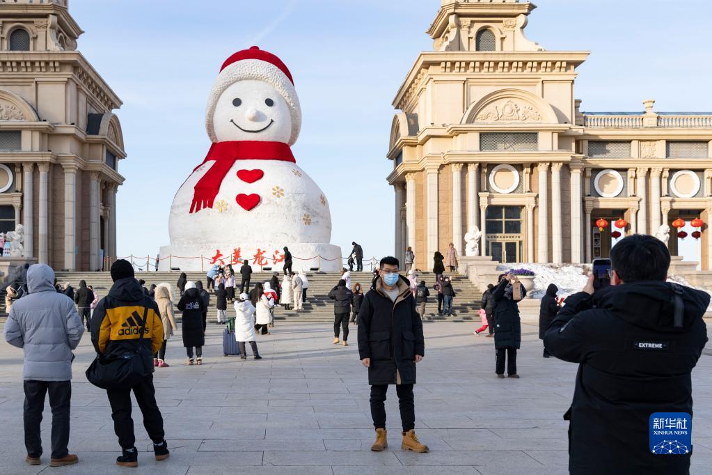 1月14日,游客前來(lái)“打卡”松花江哈爾濱段江畔的“網(wǎng)紅”大雪人。