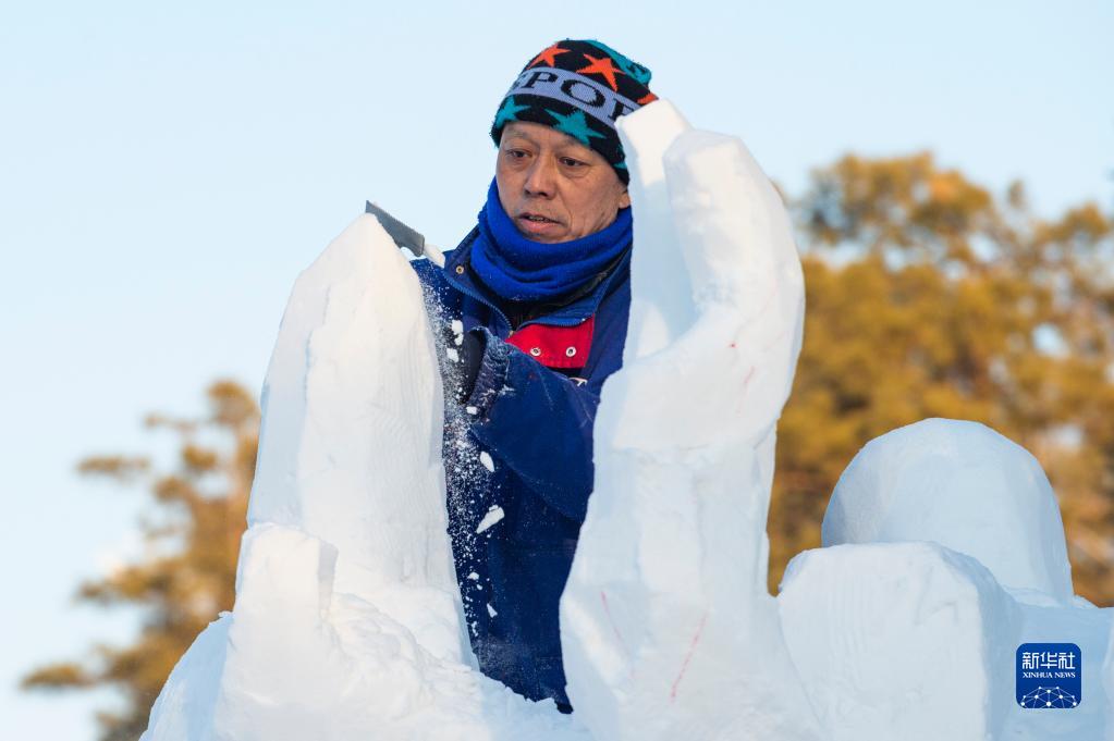 1月10日,在哈爾濱太陽(yáng)島雪博會(huì )園區,第二十三屆黑龍江省雪雕比賽參賽選手進(jìn)行雪雕創(chuàng )作。