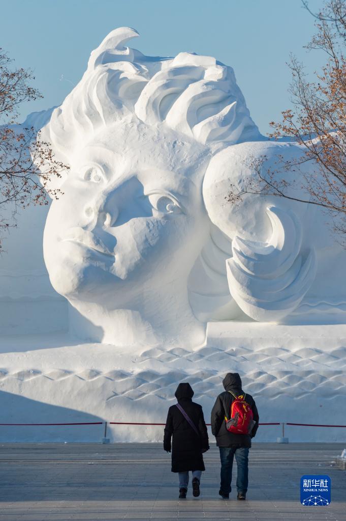 1月3日,游客在哈爾濱太陽(yáng)島雪博會(huì )園區內觀(guān)賞大型雪雕。