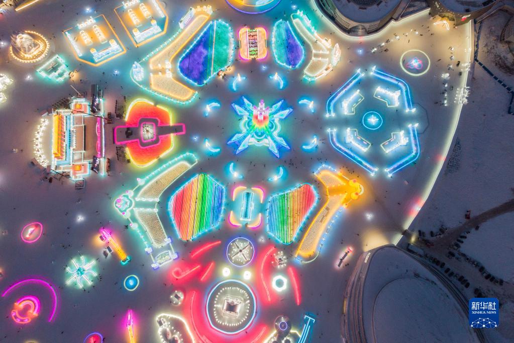 1月3日拍攝的哈爾濱冰雪大世界園區夜景(無(wú)人機照片)。