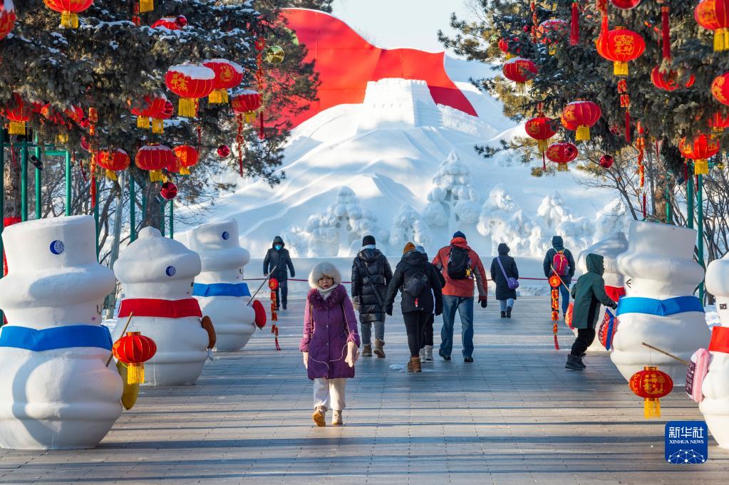 1月3日,游客在哈爾濱太陽(yáng)島雪博會(huì )園區觀(guān)賞游玩。
