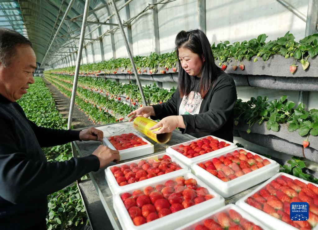 1月15日,昌黎縣昌黎鎮劉李莊村的農民在大棚內包裝采摘的草莓。