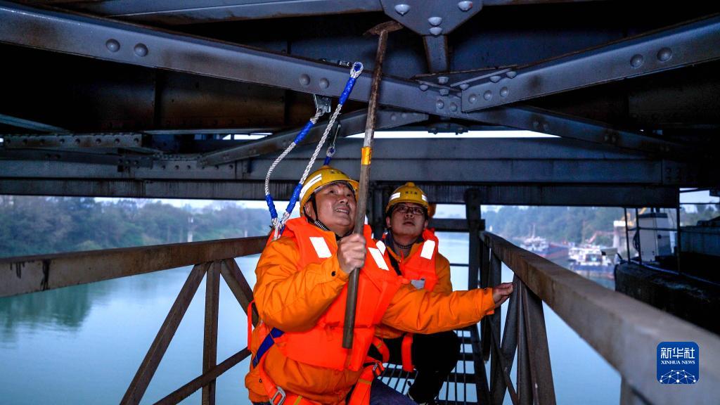 1月14日,在廣西貴港市,陳榮興(前)和陳龍在檢查鐵路郁江橋鋼梁。