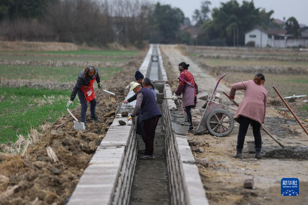 1月14日,在綿竹市新市鎮石虎村,村民參與排灌渠整理工作。