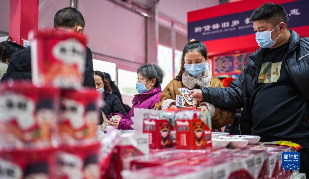市民在貴陽(yáng)市南明區蘭花廣場(chǎng)年貨節現場(chǎng)選購商品(1月14日攝)。
