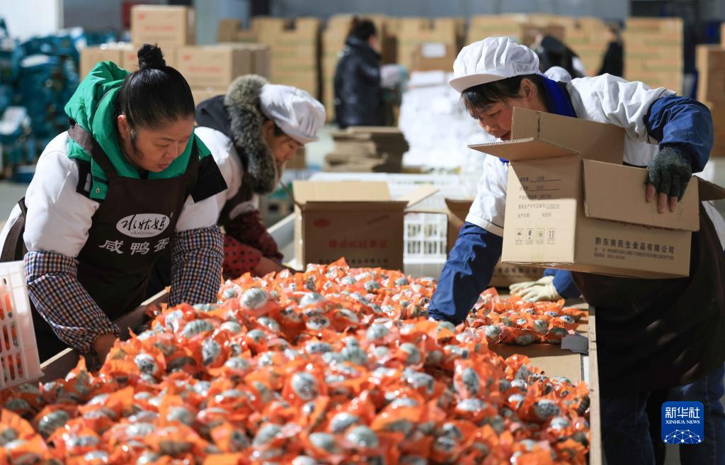 1月16日,工人在貴州省黔東南苗族侗族自治州三穗縣一家食品加工廠(chǎng)分揀咸鴨蛋。