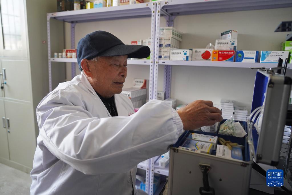 在江西省豐城市鐵路鎮楊坊村衛生所,村醫徐秋生檢查藥箱,準備前往行動(dòng)不便的徐全香老人家中巡診(1月11日攝)。