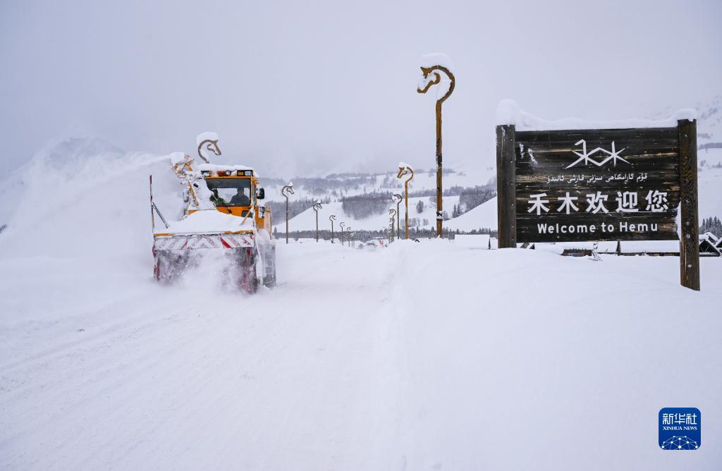 清雪車(chē)在新疆阿勒泰地區禾木村清理道路積雪(1月10日攝)。