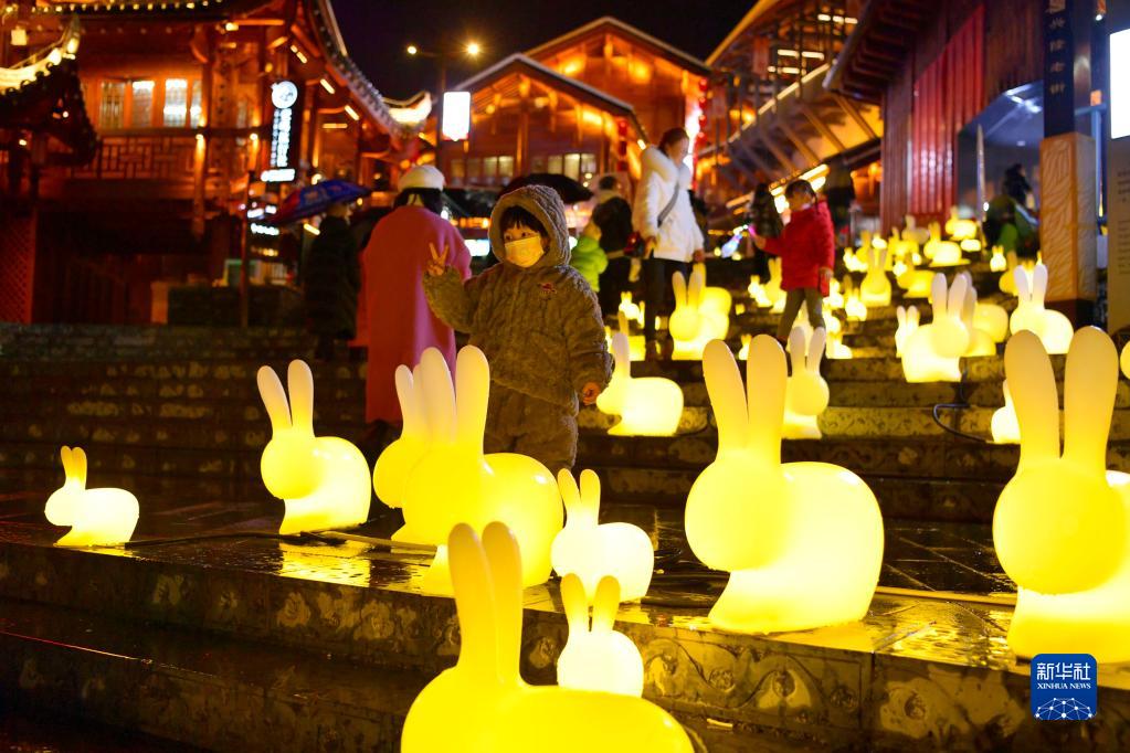 1月15日晚,人們在湖北省恩施土家族苗族自治州宣恩縣城貢水河畔觀(guān)賞兔元素彩燈。