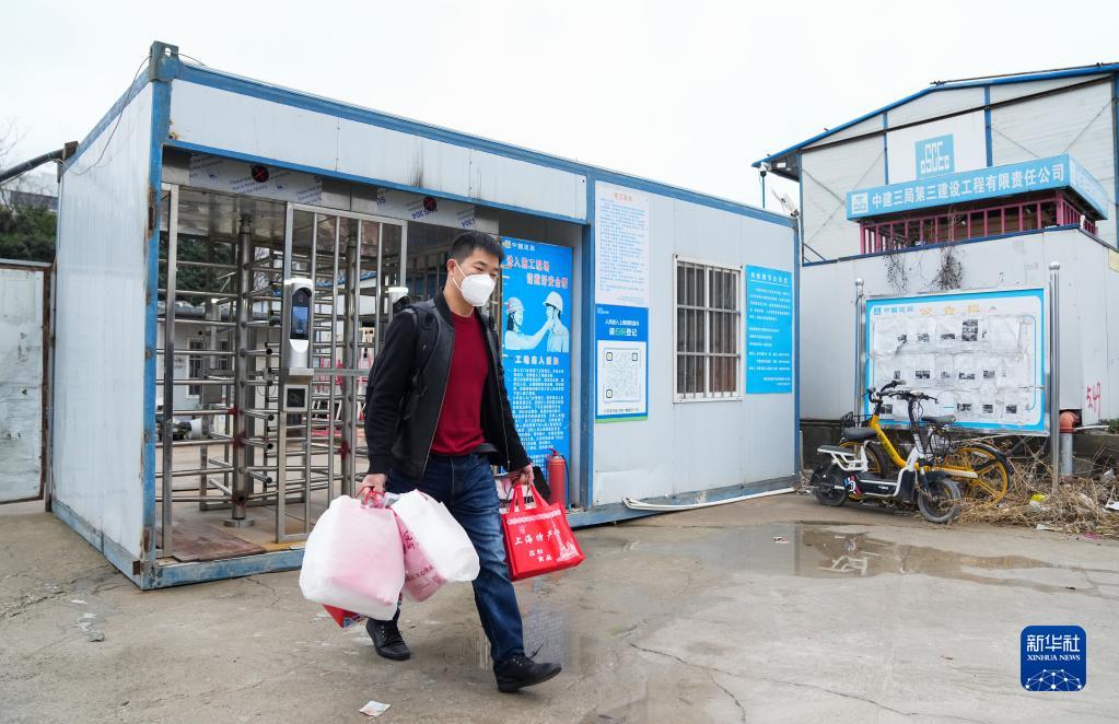 1月15日,在位于上海市普陀區的中建三局三公司的項目工地,易生軍背著(zhù)行囊走出大門(mén)。
