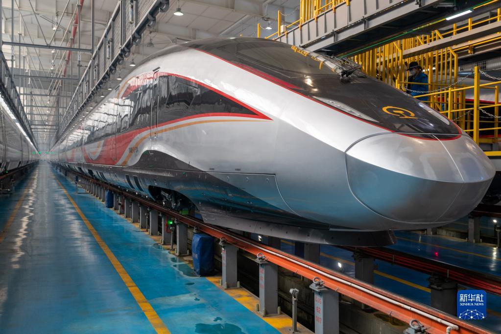 這是??吭谥袊F路哈爾濱局集團有限公司哈爾濱動(dòng)車(chē)段檢修車(chē)間內的CR400BF-GZ型復興號高寒智能動(dòng)車(chē)組(1月16日攝)。