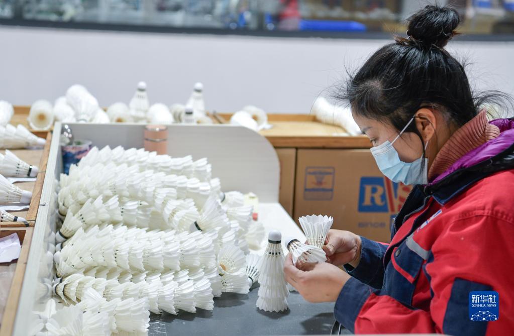 在錦屏經(jīng)濟開(kāi)發(fā)區貴州亞獅龍體育文化產(chǎn)業(yè)發(fā)展有限公司羽毛球生產(chǎn)基地,工人檢查羽毛球成品(2022年12月19日攝)。