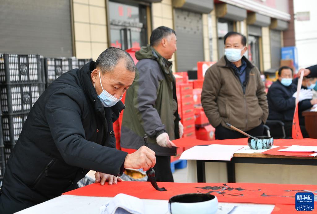 1月16日,陜西省西安市臨潼區神東村書(shū)法愛(ài)好者在村委會(huì )舉辦的年貨節上為村民撰寫(xiě)春聯(lián)。