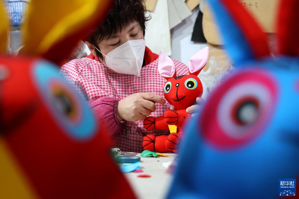 1月16日,手工藝人在山東省濱州市濱城區彭李街道的一家手工藝坊制作布藝兔。