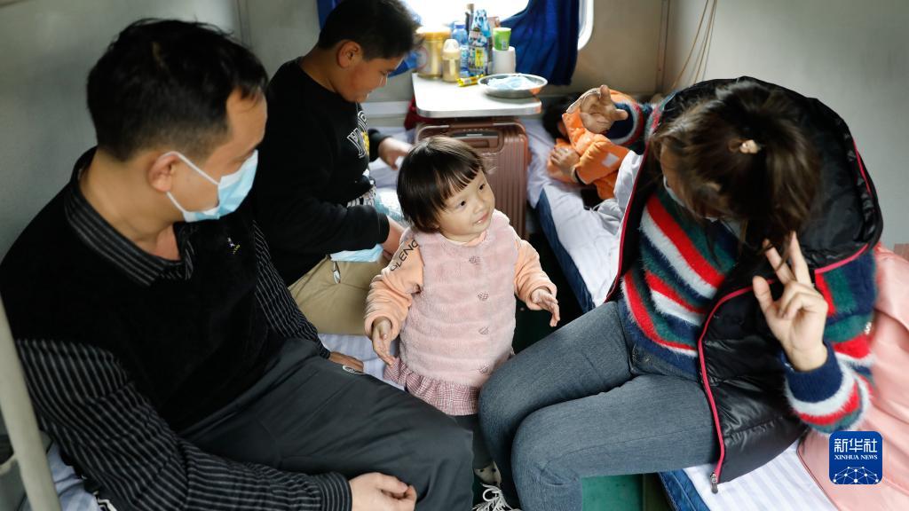 1月16日,返鄉的一家人在開(kāi)往冊亨的綠皮火車(chē)臥鋪車(chē)廂玩耍。