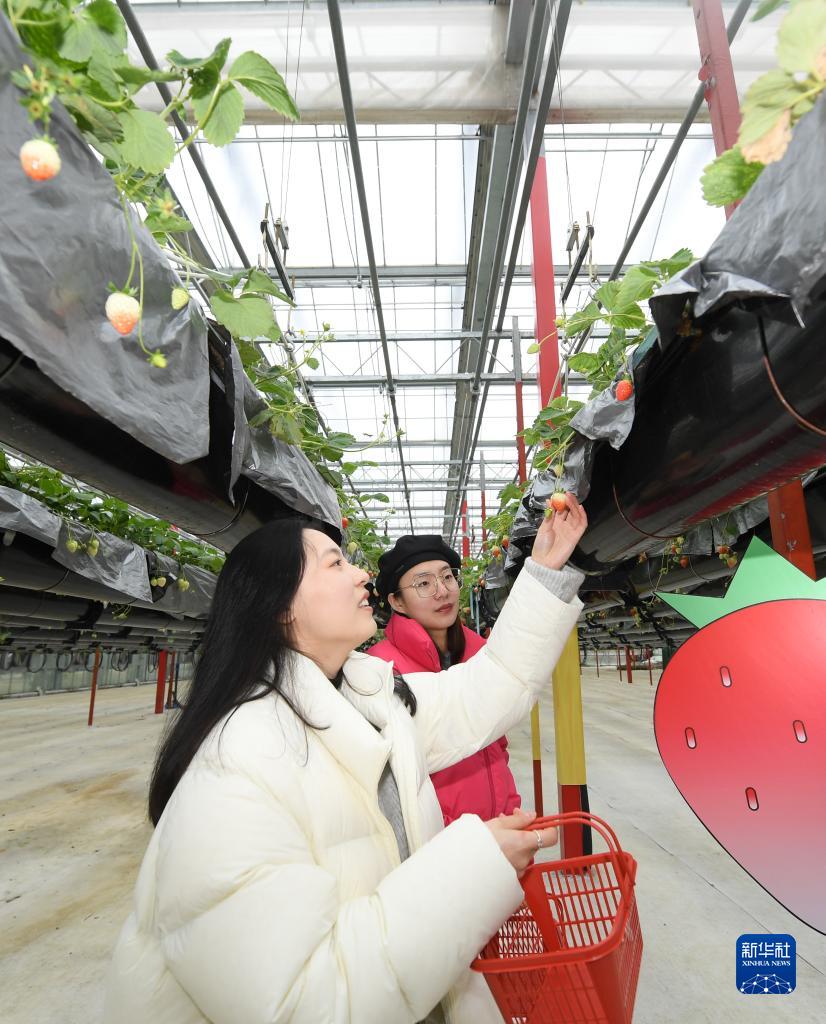1月17日,游客在浙江省建德市楊村橋鎮草莓小鎮內的“草莓天空之城”體驗草莓采摘。