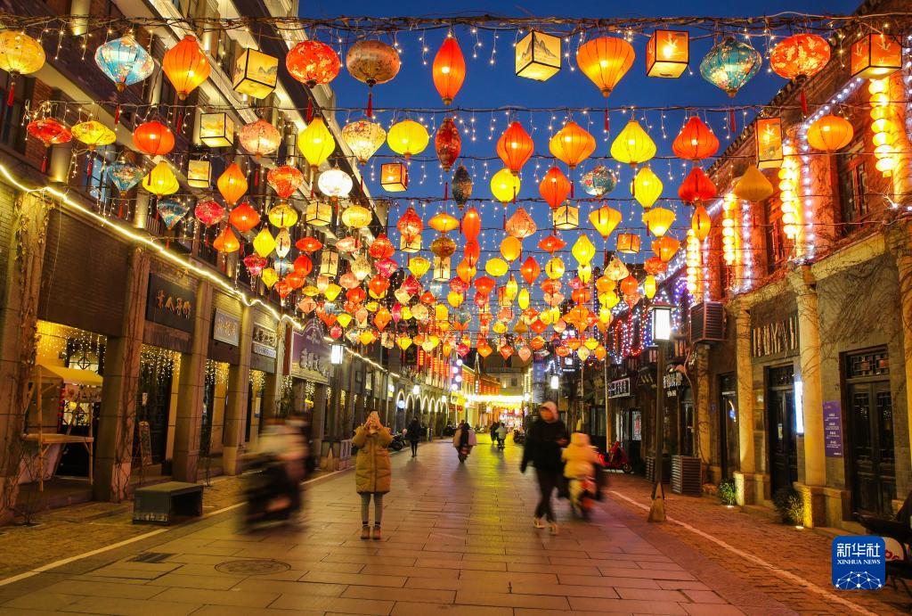1月16日,江蘇連云港市民主路老街,流光溢彩的花燈點(diǎn)亮了老街小巷夜色。
