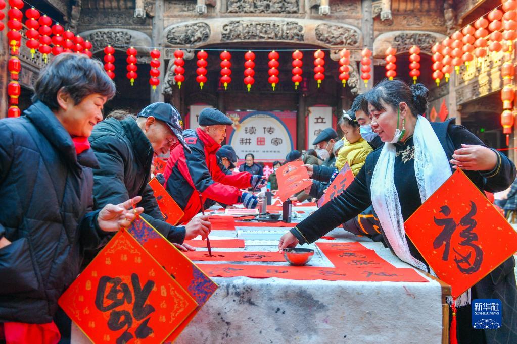 1月17日,在浙江省湖州市長(cháng)興縣李家巷鎮石泉村文化禮堂內,文化志愿者為村民現場(chǎng)寫(xiě)春聯(lián)和“?!弊?。