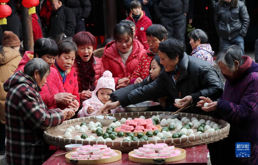 1月17日,浙江省湖州市德清縣舞陽(yáng)街道山民村村民在做圓子、制禮糕。