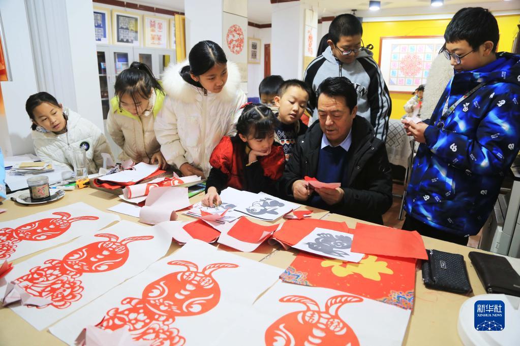 1月17日,在甘肅省定西市安定區文化館,剪紙傳承人教授學(xué)生創(chuàng )作生肖兔剪紙作品。