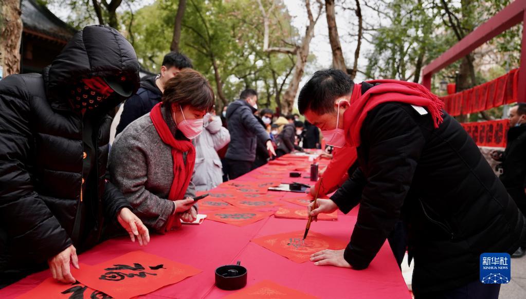 1月17日,書(shū)法愛(ài)好者在南昌市百花洲八一公園的“迎新春 送祝?!被顒?dòng)上為市民寫(xiě)福字。