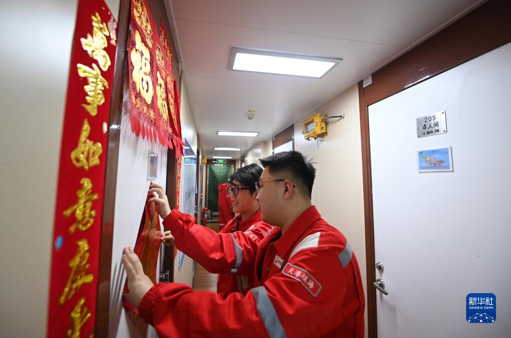 埕海一號海上采油平臺中控崗位員工聶虓宇(右)和同事將福字貼在宿舍門(mén)口(1月16日攝)。