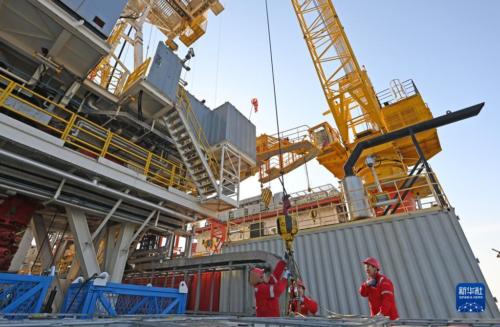 埕海一號海上采油平臺工作人員在平臺甲板進(jìn)行吊裝作業(yè)(1月16日攝)。