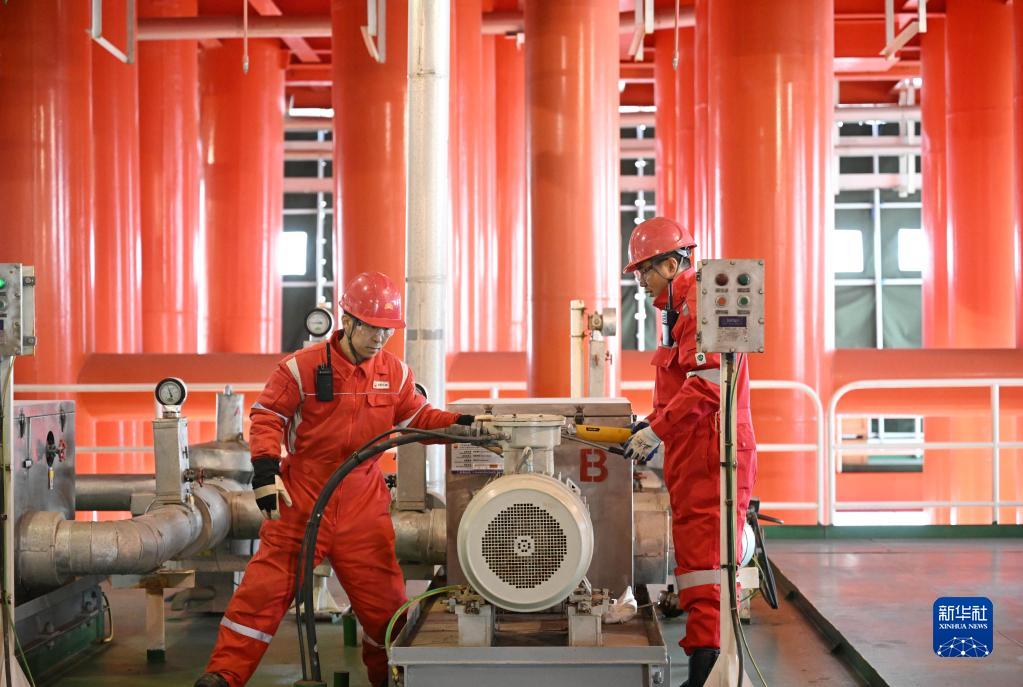 埕海一號海上采油平臺機械工人在對閉排泵進(jìn)行維護作業(yè)(1月16日攝)。