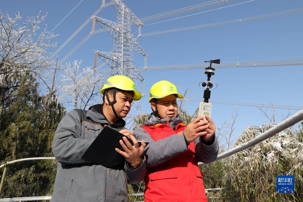 1月16日,在銅陵市義安區天門(mén)鎮,國網(wǎng)安徽省電力公司運維人員觀(guān)測輸電線(xiàn)路覆冰情況。