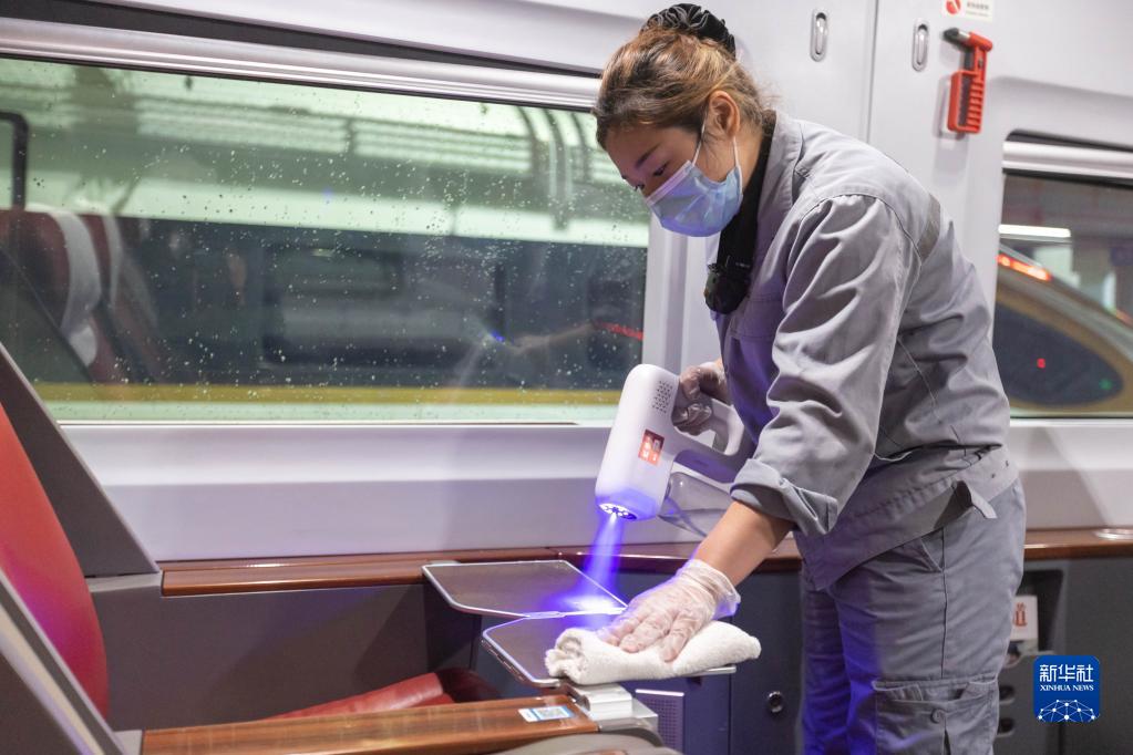 春運期間,上海華鐵旅客服務(wù)有限公司工作人員對入庫終到上海動(dòng)車(chē)段虹橋動(dòng)車(chē)運用所的動(dòng)車(chē)組列車(chē)開(kāi)展消毒清潔作業(yè),守護平安健康春運。